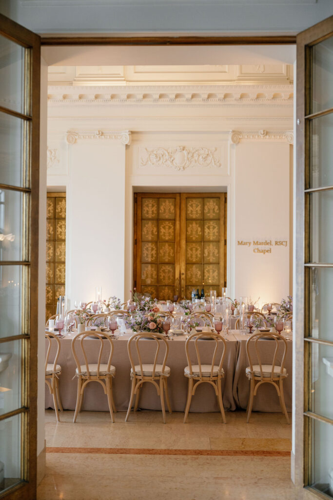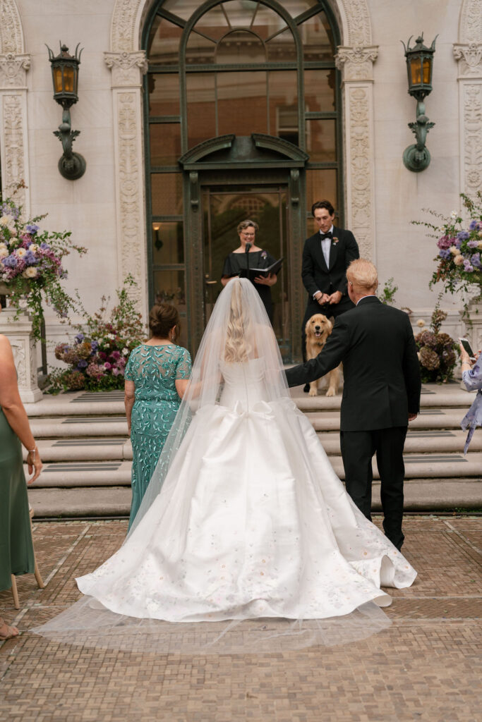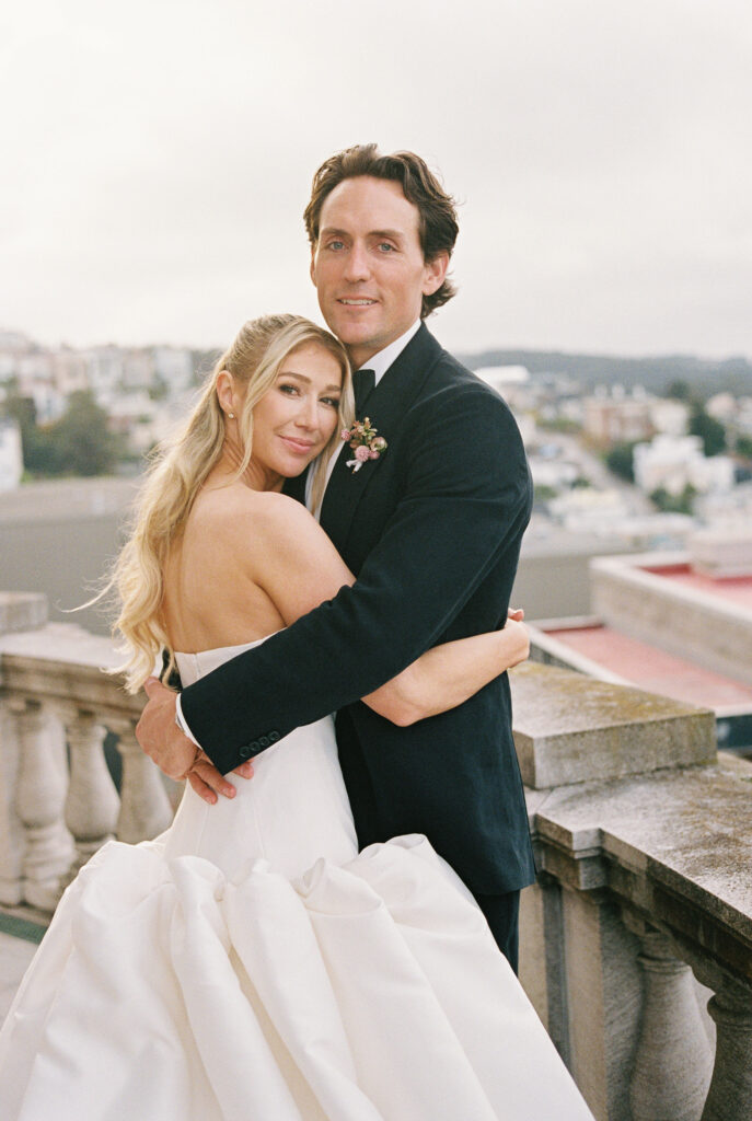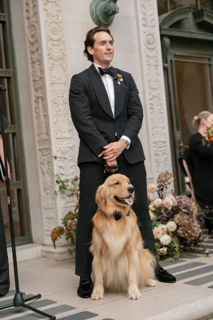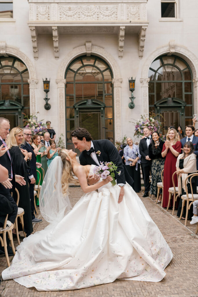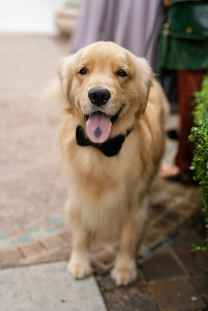 Flood Mansion is one of our favorite San Francisco venues to photograph weddings at because of it’s beautiful architecture, lighting, and views of the Golden Gate Bridge. For Jenny and Pete’s wedding, we worked alongside Dream A Little Dream Events who beautifully designed a chic, modern feel that blended perfectly with the historic charm of Flood Mansion. Shades of lavender and dusty rose were in every detail, from the gorgeous flowers by M Flora Design to the stationery, linens, tabletop rentals, and even our bride’s dress! Jenny wore a stunning Nicole + Felicia gown with painted florals on the hem, truly one of the most beautiful dresses we’ve photographed! Later in the evening, she changed into a more modern, chic Danielle Frankel dress that was perfect for dinner and dancing. One of the highlights of their wedding was their adorable Golden Retriever who joined them during the ceremony and even waited up at the alter for Jenny to walk down the aisle!