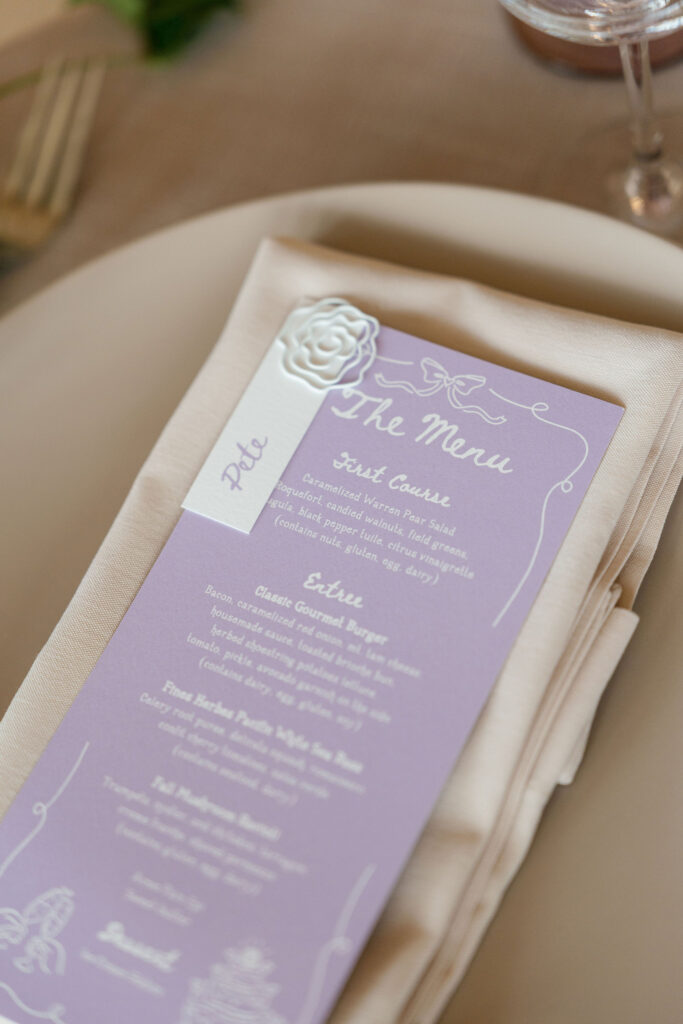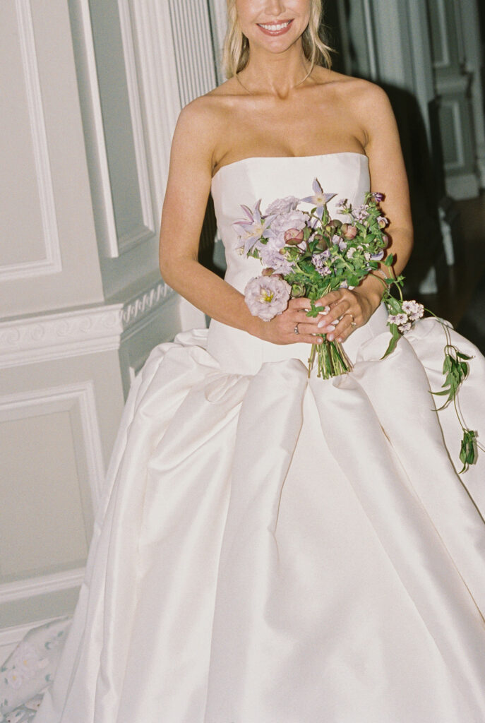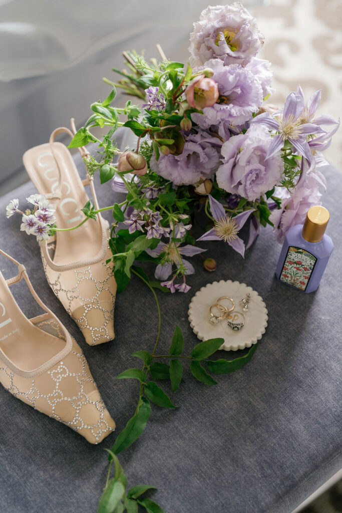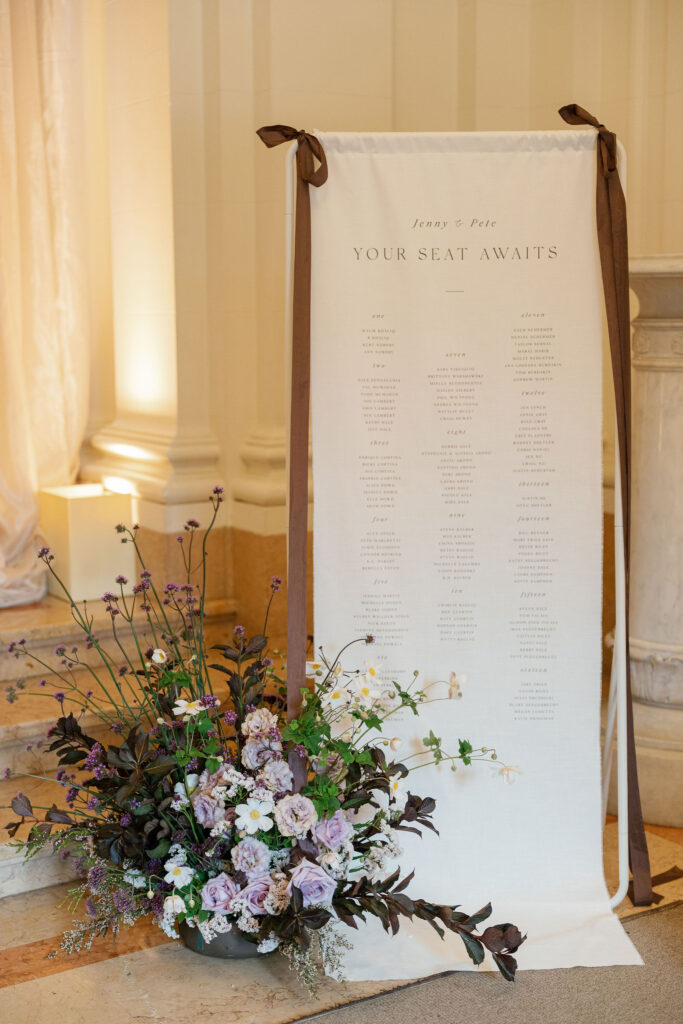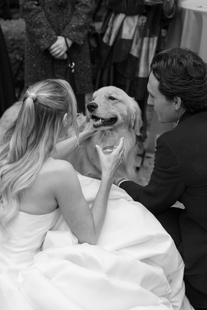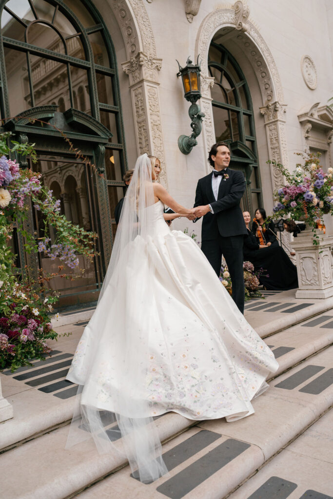 Flood Mansion is one of our favorite San Francisco venues to photograph weddings at because of it’s beautiful architecture, lighting, and views of the Golden Gate Bridge. For Jenny and Pete’s wedding, we worked alongside Dream A Little Dream Events who beautifully designed a chic, modern feel that blended perfectly with the historic charm of Flood Mansion. Shades of lavender and dusty rose were in every detail, from the gorgeous flowers by M Flora Design to the stationery, linens, tabletop rentals, and even our bride’s dress! Jenny wore a stunning Nicole + Felicia gown with painted florals on the hem, truly one of the most beautiful dresses we’ve photographed! Later in the evening, she changed into a more modern, chic Danielle Frankel dress that was perfect for dinner and dancing. One of the highlights of their wedding was their adorable Golden Retriever who joined them during the ceremony and even waited up at the alter for Jenny to walk down the aisle!